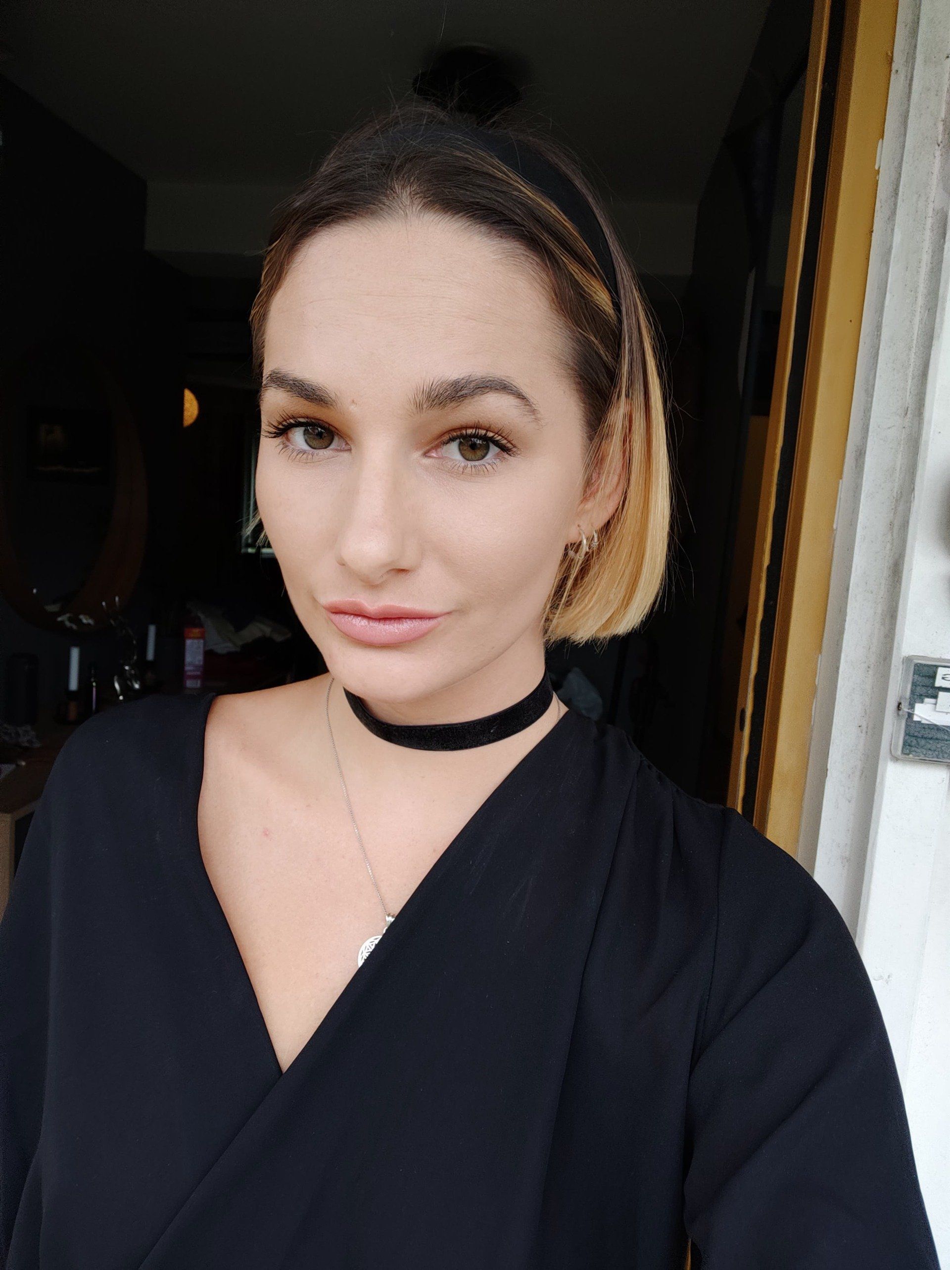 Has short hair and blonde ombre.